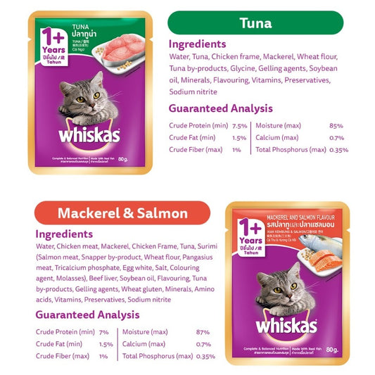 Whiskas Cat Wet Food Pouch - Tuna Flavor (12-pack) ,80g & Ocean Fish Flavor (12-pack),80g. Wet Food For Cats